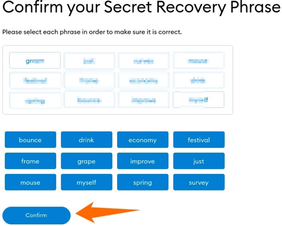 MetaMask goes to lengths to ensure you remember this critical phrase as they don’t store it for you. So you will see a word puzzle to rebuild that phrase exactly the way it was. Unless you get it right, the Confirm button at the end won’t get activated, and you won’t be able to proceed.
